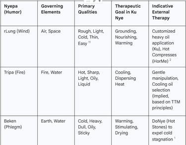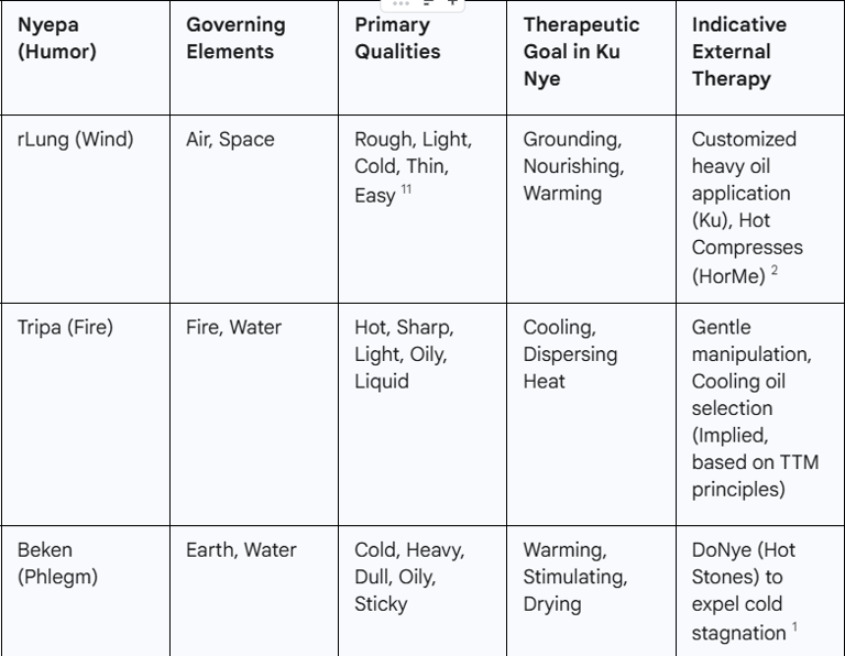 Table 1 summarizes the therapeutic logic of Ku Nye within the Nyepa Sum framework. The Three Nyepas (Vital Humors) and Ku Nye's Therapeutic Response.