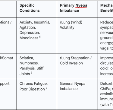 Neurological and Somatic Manifestations: Imbalances in rLung often present as disorders of movement and sensation. Ku Nye is explicitly indicated for neurological problems such as sciatica, numbness, paralysis, and stiff joints.5 By stimulating blood flow and loosening stiffness, the massage directly addresses the physical stagnation caused by disordered wind energy.