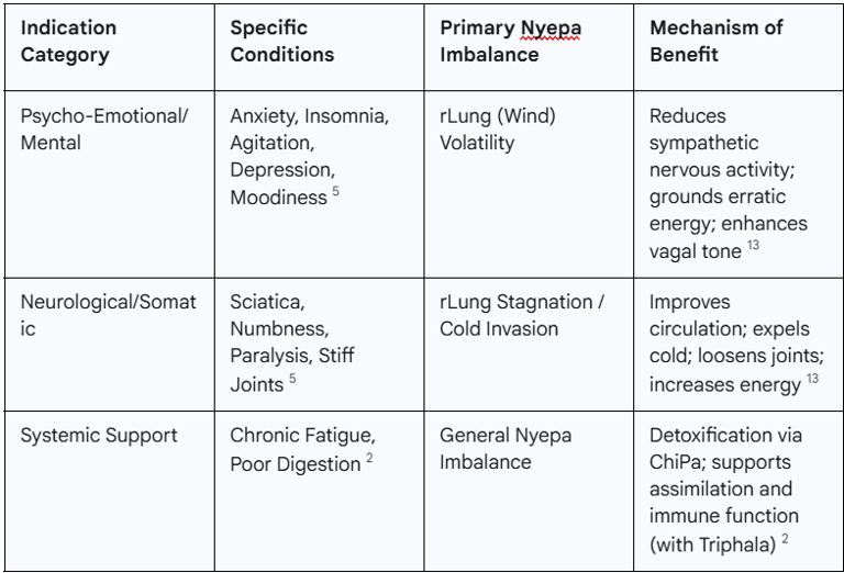 The therapeutic strategy of Ku Nye is designed to apply the opposite qualities—warmth, heaviness, and smoothness—to neutralize this prevailing coldness and volatility.11 The recurrent selection of heavy oils, warming herbal preparations, and specific thermal adjuncts (discussed later) in rLung treatments is directly explained by this theory. The physical intervention of stabilizing rLung through grounding, warming external therapies is viewed in TTM as the mechanism for regulating the patient's nervous system and addressing psycho-emotional volatility.