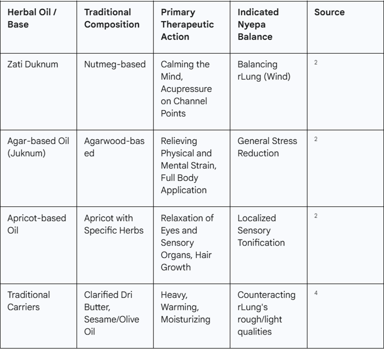 While general carrier oils like sesame oil or clarified butter provide the necessary warmth and heaviness to counteract volatile rLung 4, specialized blends are utilized for targeted psycho-physical effects. This therapeutic specificity confirms that Ku Nye relies on precision pharmacognosy, not mere aromatherapy.